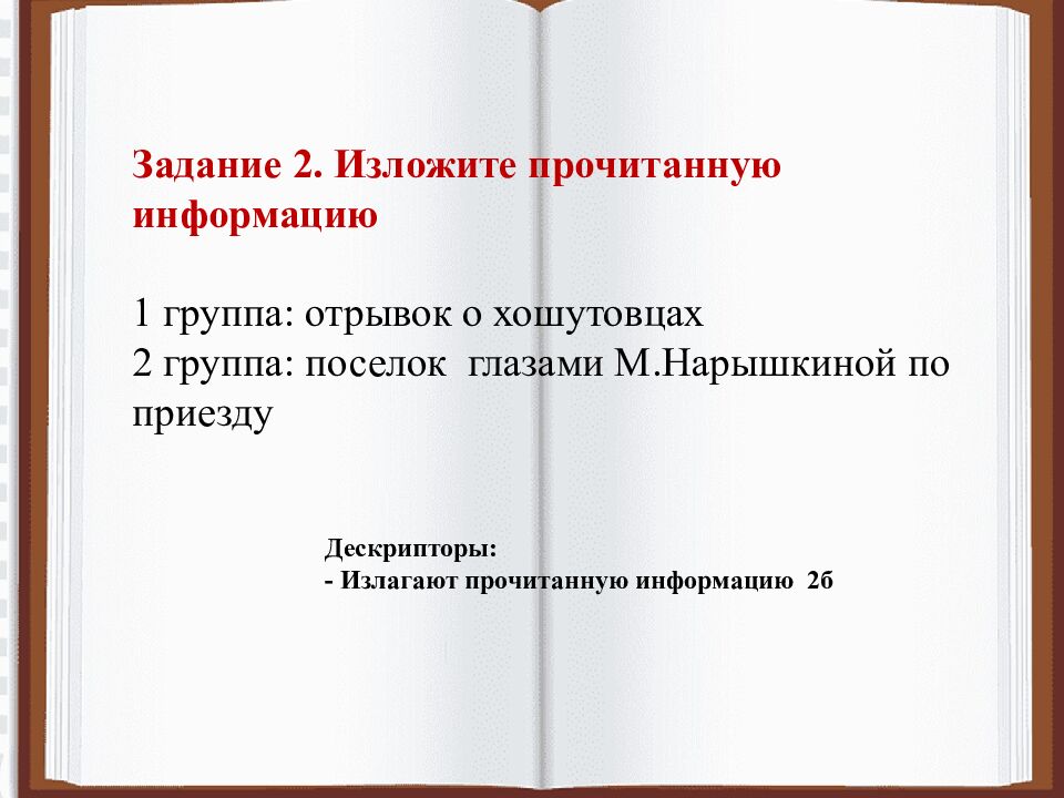 Задание 2. Изложите прочитанную информацию 1 группа: отрывок о хошутовцах 2 группа: поселок глазами М.Нарышкиной по приезду Дескрипторы: - Излагают прочитанную информацию 2б