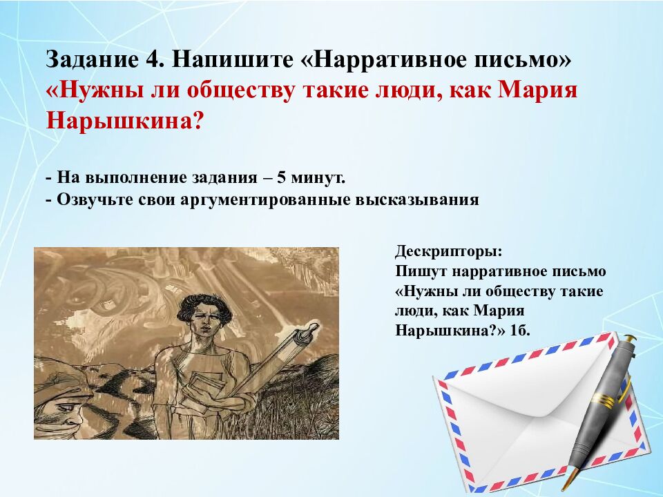 Задание 4. Напишите « Нарративное письмо» «Нужны ли обществу такие люди, как Мария Нарышкина? - На выполнение задания – 5 минут. - Озвучьте свои аргументированные высказывания Дескрипторы: Пишут нарративное письмо «Нужны ли обществу такие люди, как Мария Нарышкина?» 1б.