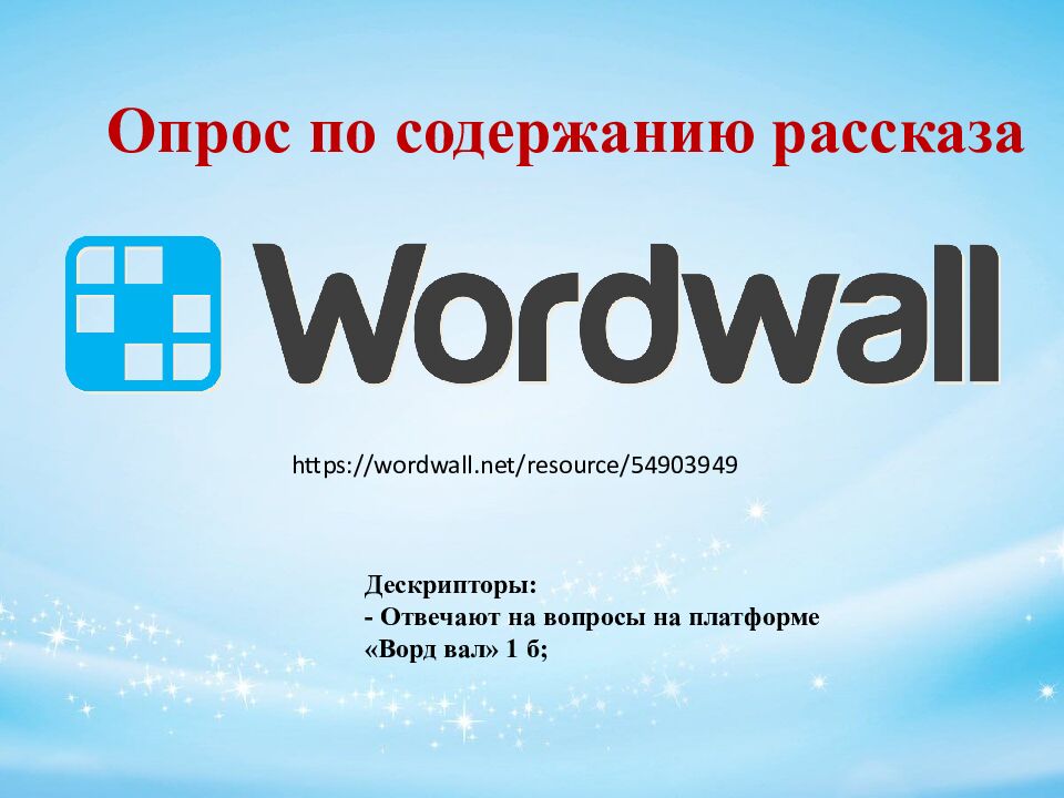 Опрос по содержанию рассказа Дескрипторы: - Отвечают на вопросы на платформе « Ворд вал» 1 б; https://wordwall.net/resource/54903949