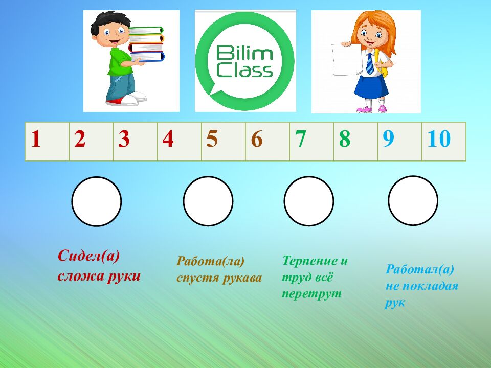 1 2 3 4 5 6 7 8 9 10 Сидел(а) с ложа руки Работа(ла) с пустя рукава Терпение и труд всё перетрут Работал(а) не покладая рук