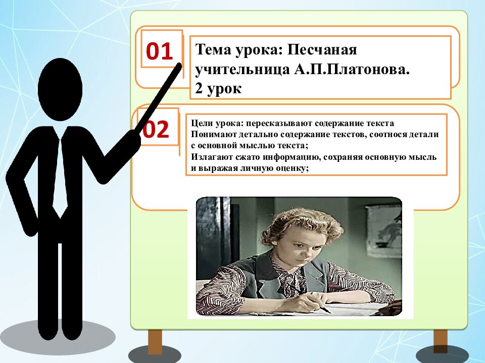 01 Тема урока: Песчаная учительница А.П.Платонова. 2 урок 02 Цели урока: п ересказывают содержание текста Понимают детально содержание текстов, соотнося детали с основной мыслью текста; Излагают сжато информацию, сохраняя основную мысль и выражая личную оценку;