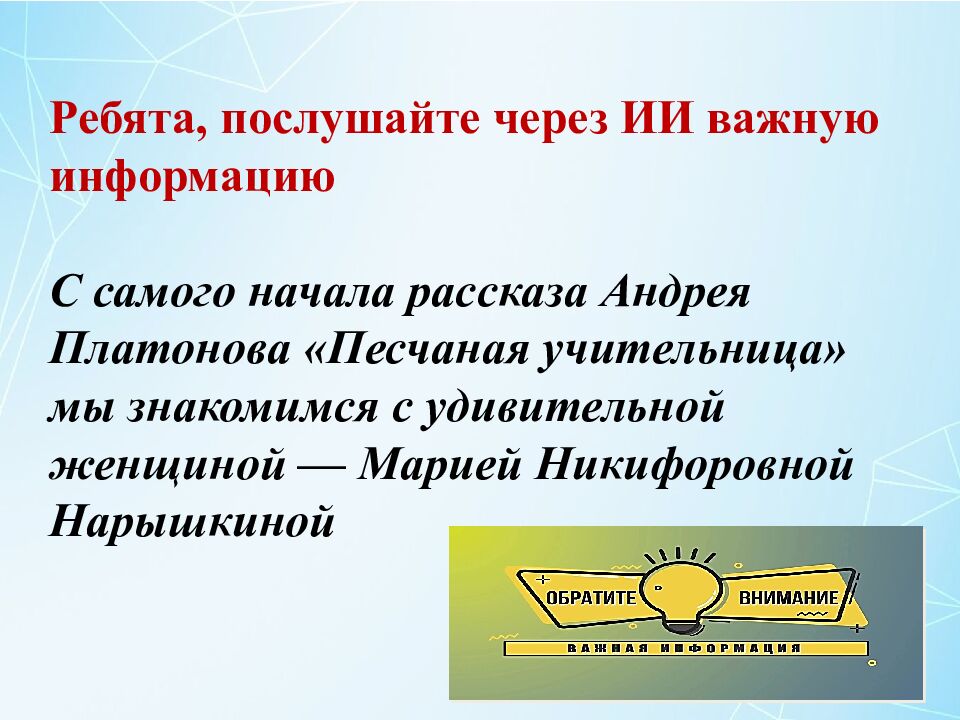 Ребята, послушайте через ИИ важную информацию С самого начала рассказа Андрея Платонова «Песчаная учительница» мы знакомимся с удивительной женщиной — Марией Никифоровной Нарышкиной