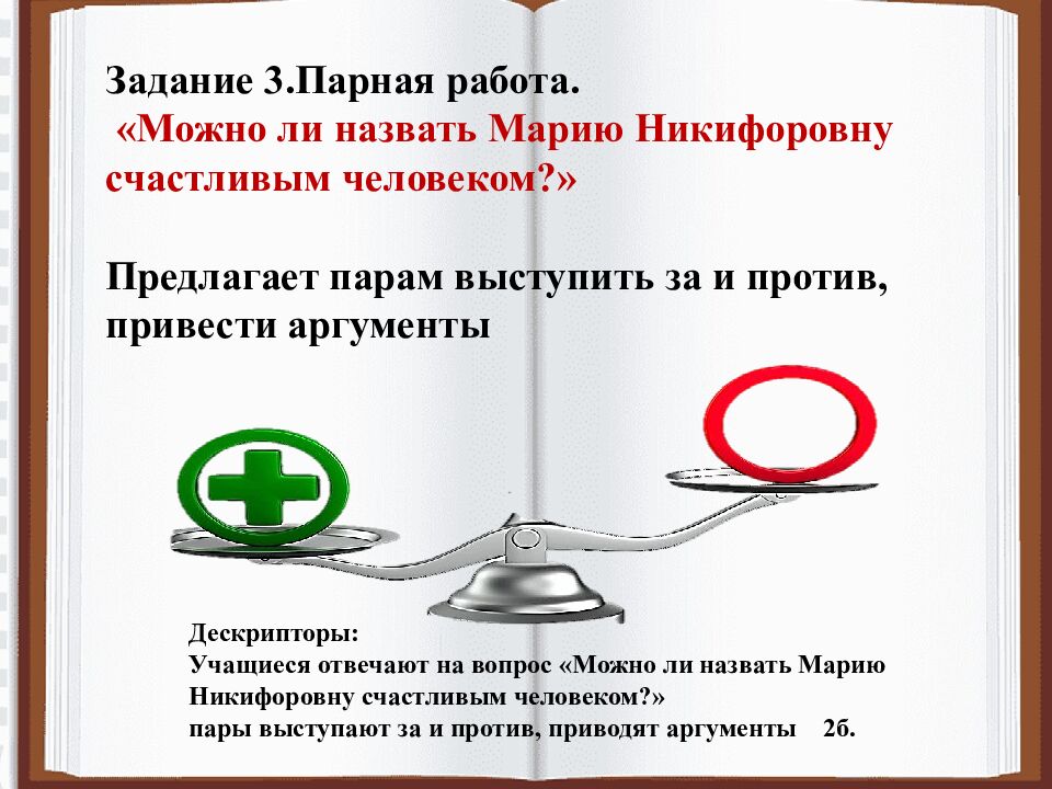 Задание 3.Парная работа. «Можно ли назвать Марию Никифоровну счастливым человеком?» Предлагает парам выступить за и против, привести аргументы Дескрипторы: Учащиеся отвечают на вопрос «Можно ли назвать Марию Никифоровну счастливым человеком?» пары выступают за и против, приводят аргументы 2б.