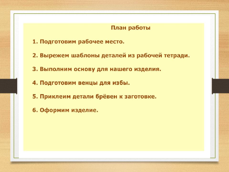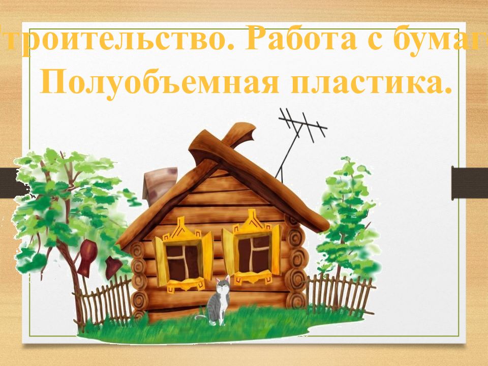 Тема урока: Строительство. Работа с бумагой. Полуобъемная пластика. Цель: Научиться различать компоненты строения избы. Научиться создавать полуобъемную аппликацию. Познакомить с профессией плотник. Развивать воображение, фантазию. Изделие: композиция «Изба».