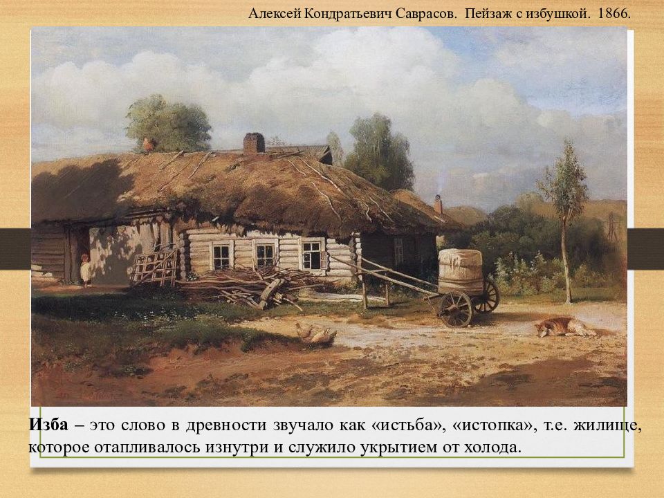 Алексей Кондратьевич Саврасов. Пейзаж с избушкой. 1866. Изба – это слово в древности звучало как « истьба », « истопка », т.е. жилище, которое отапливалось изнутри и служило укрытием от холода.