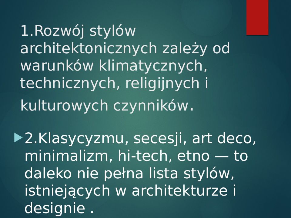 Слайд 11: 1.Rozwój stylów architektonicznych zależy od warunków klimatycznych, technicznych, religijnych i kulturowych czynników