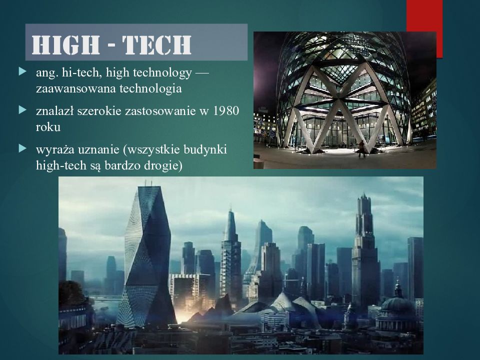 ang. hi-tech, high technology — zaawansowana technologia znalazł szerokie zastosowanie w 1980 roku wyraża uznanie (wszystkie budynki high-tech są bardzo drogie)