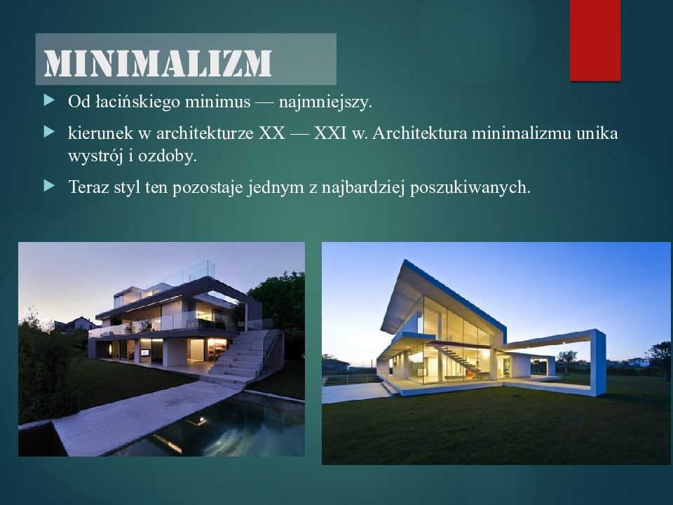 Od łacińskiego minimus — najmniejszy. kierunek w architekturze XX — XXI w. Architektura minimalizmu unika wystrój i ozdoby. Teraz styl ten pozostaje jednym z najbardziej poszukiwanych.
