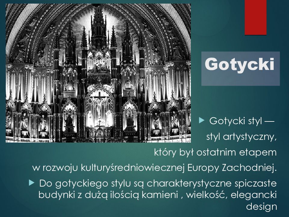 G otycki styl — styl artystyczny, który był ostatnim etapem w rozwoju kulturyśredniowiecznej Europy Zachodniej. Do gotyckiego stylu są charakterystyczne spiczaste budynki z dużą ilością kamieni, wielkość, elegancki design