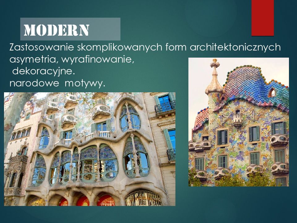 M odern Z astosowanie skomplikowanych form architektonicznych asymetria, wyrafinowanie, dekoracyjne. narodowe motywy.