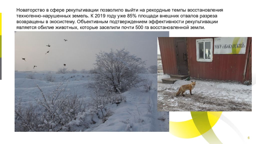 6 Новаторство в сфере рекультивации позволило выйти на рекордные темпы восстановления техногенно - нарушенных земель. К 2019 году уже 85% площади внешних отвалов разреза возвращены в экосистему. Объективным подтверждением эффективности рекультивации является обилие животных, которые заселили почти 500 га восстановленной земли.