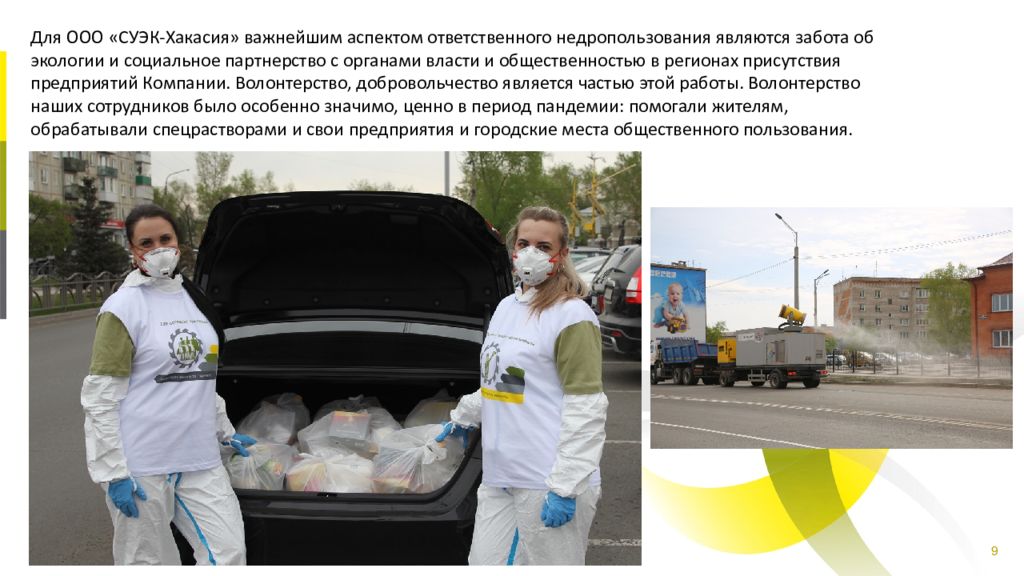9 Для ООО «СУЭК-Хакасия» важнейшим аспектом ответственного недропользования являются забота об экологии и социальное партнерство с органами власти и общественностью в регионах присутствия предприятий Компании. Волонтерство, добровольчество является частью этой работы. Волонтерство наших сотрудников было особенно значимо, ценно в период пандемии: помогали жителям, обрабатывали спецрастворами и свои предприятия и городские места общественного пользования.