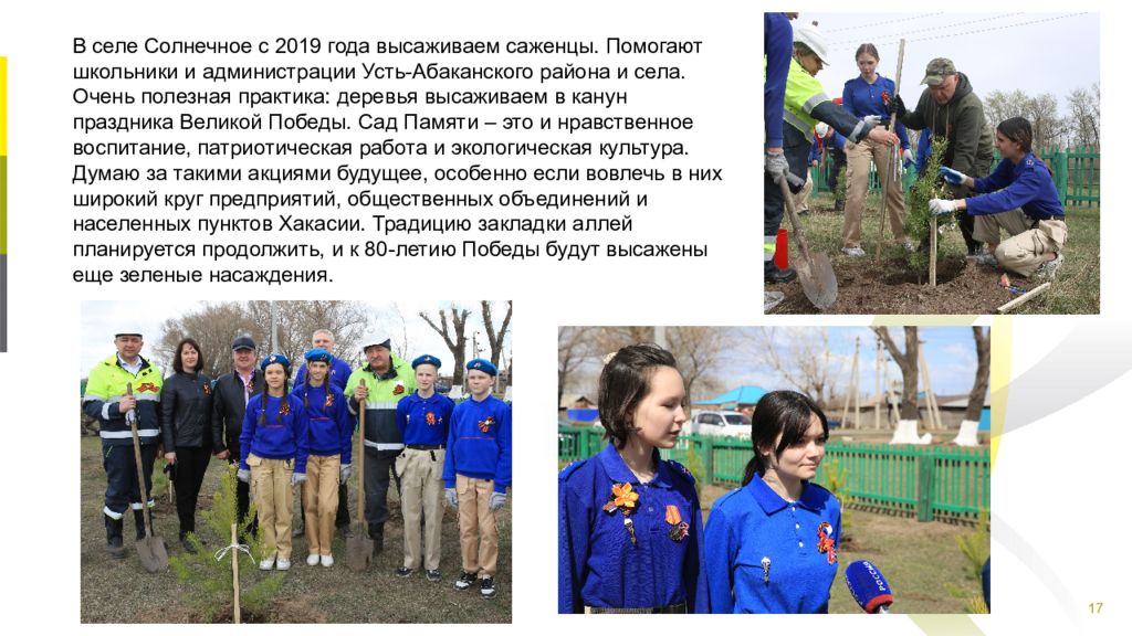 17 В селе Солнечное с 2019 года высаживаем саженцы. Помогают школьники и администрации Усть-Абаканского района и села. Очень полезная практика: деревья высаживаем в канун праздника Великой Победы. Сад Памяти – это и нравственное воспитание, патриотическая работа и экологическая культура. Думаю за такими акциями будущее, особенно если вовлечь в них широкий круг предприятий, общественных объединений и населенных пунктов Хакасии. Т радицию закладки аллей планируется продолжить, и к 80-летию Победы будут высажены еще зеленые насаждения.