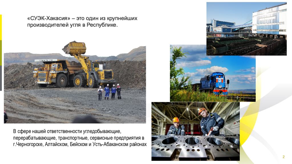 2 «СУЭК-Хакасия» – это один из крупнейших производителей угля в Республике. В сфере нашей ответственности угледобывающие, перерабатывающие, транспортные, сервисные предприятия в г.Черногорске, Алтайском, Бейском и Усть-Абаканском районах