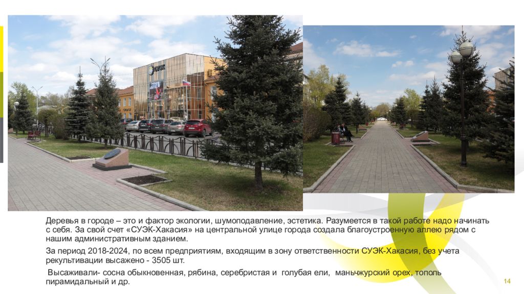 Деревья в городе – это и фактор экологии, шумоподавление, эстетика. Разумеется в такой работе надо начинать с себя. За свой счет «СУЭК-Хакасия» на центральной улице города создала благоустроенную аллею рядом с нашим административным зданием. За период 2018-2024, по всем предприятиям, входящим в зону ответственности СУЭК-Хакасия, без учета рекультивации высажено - 3505 шт. Высаживали- сосна обыкновенная, рябина, серебристая и голубая ели, маньчжурский орех, тополь пирамидальный и др. 14