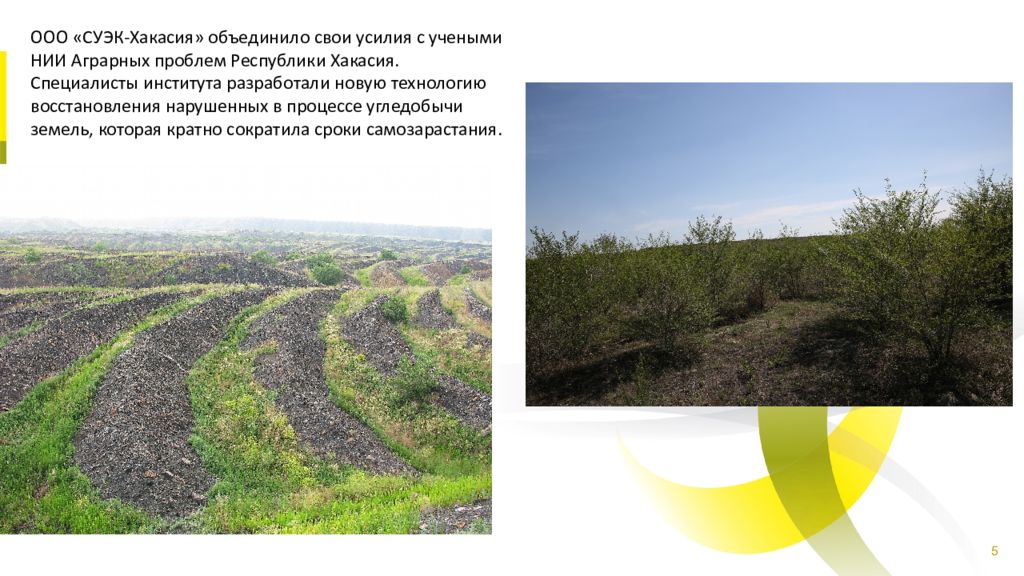 5 ООО «СУЭК-Хакасия» объединило свои усилия с учеными НИИ Аграрных проблем Республики Хакасия. Специалисты института разработали новую технологию восстановления нарушенных в процессе угледобычи земель, которая кратно сократила сроки самозарастания.