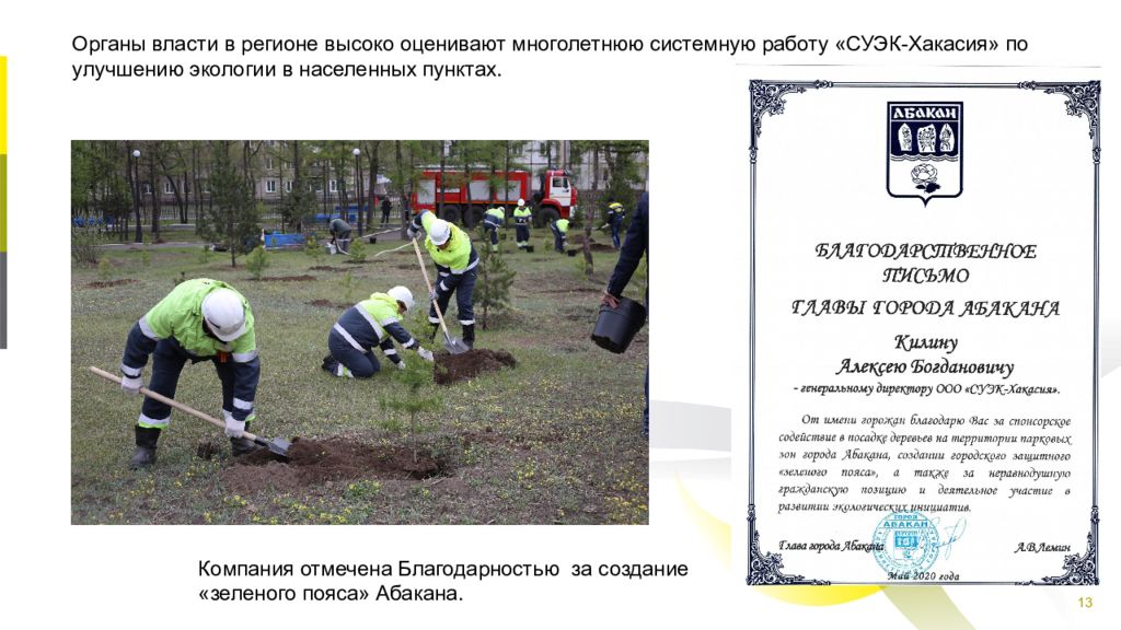 13 Органы власти в регионе высоко оценивают многолетнюю системную работу «СУЭК-Хакасия» по улучшению экологии в населенных пунктах. Компания отмечена Благодарностью за создание «зеленого пояса» Абакана.