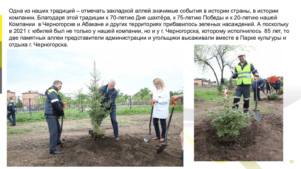12 Одна из наших традиций – отмечать закладкой аллей значимые события в истории страны, в истории компании. Благодаря этой традиции к 70-летию Дня шахтёра, к 75-летию Победы и к 20-летию нашей Компании в Черногорске и Абакане и других территориях прибавилось зеленых насаждений. А поскольку в 2021 г. юбилей был не только у нашей компании, но и у г. Черногорска, которому исполнилось 85 лет, то две памятных аллеи представители администрации и угольщики высаживали вместе в Парке культуры и отдыха г. Черногорска.