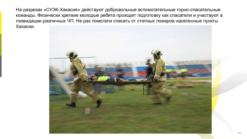 10 На разрезах «СУЭК-Хакасия» действуют добровольные вспомогательные горно-спасательные команды. Физически крепкие молодые ребята проходят подготовку как спасатели и участвуют в ликвидации различных ЧП. Не раз помогали спасать от степных пожаров населенные пункты Хакасии.
