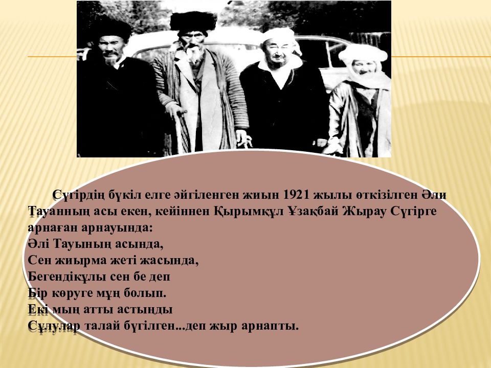 Сүгірдің бүкіл елге әйгіленген жиын 1921 жылы өткізілген Әли Тауанның асы екен, кейіннен Қырымқұл Ұзақбай Жырау Сүгірге арнаған арнауында : Әлі Тауының асында, Сен жиырма жеті жасында, Бегендікұлы сен бе деп Бір көруге мұң болып. Екі мың атты астыңды Сұлулар талай бүгілген... деп жыр арнапты.