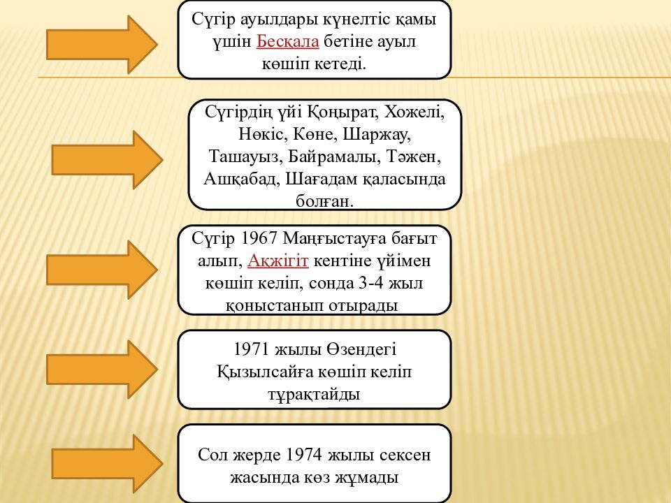 Сүгір ауылдары күнелтіс қамы үшін Бесқала бетіне ауыл көшіп кетеді. Сүгірдің үйі Қоңырат, Хожелі, Нөкіс, Көне, Шаржау, Ташауыз, Байрамалы, Тәжен, Ашқабад, Шағадам қаласында бол ған. Сүгір 1967 Маңғыстауға бағыт алып, Ақжігіт кентіне үйімен көшіп келіп, сонда 3-4 жыл қоныстанып отырады 1971 жылы Өзендегі Қызылсайға көшіп келіп тұрақтайды Сол жерде 1974 жылы сексен жасында көз жұмады