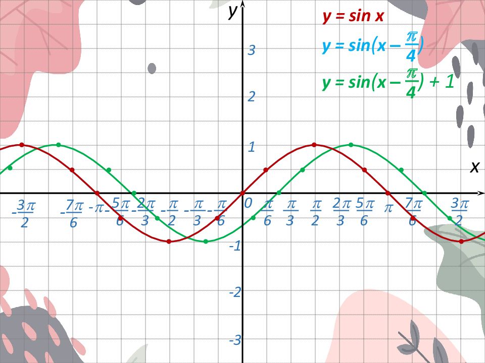 0 - - 2 3 6 6 - 7 6 - 5 6 2 х y 3 2 3 5 6 - 3 - 2 1 2 3 -1 -2 -3 - 3 2 - 7 6 3 2 y = sin x y = sin ( x – ) 4 y = sin ( x – ) + 1 4