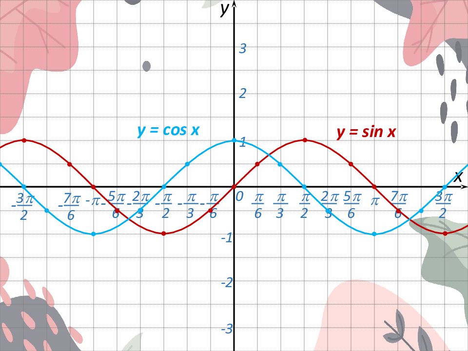 2 0 х y 6 3 2 3 5 6 6 - - 3 - 2 - 1 2 3 -1 -2 -3 - 2 3 - 5 6 - 3 2 - 7 6 7 6 3 2 y = sin x y = соs x