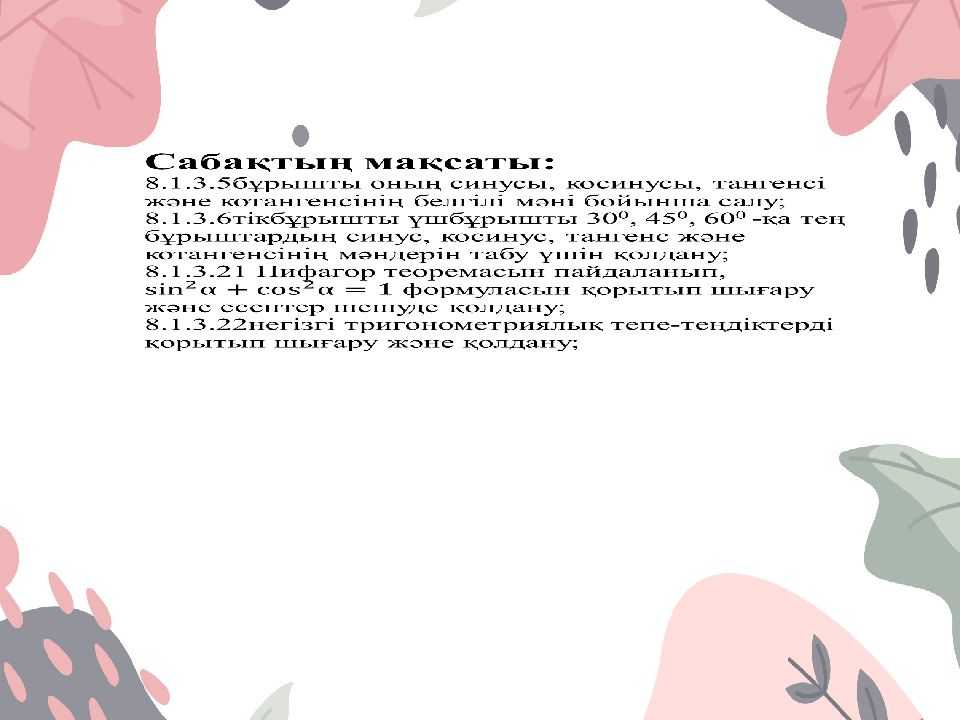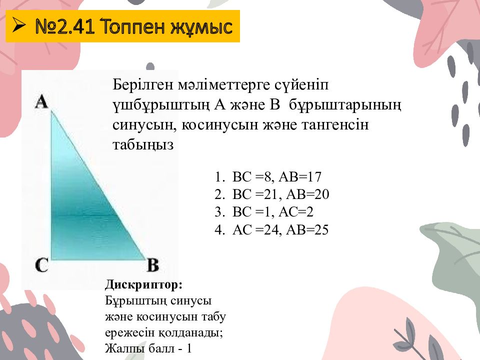 Последний слайд презентации: Сүйір бұрыштың синусы, тангенсі және котангенсі: 2.41 Топпен жұмыс