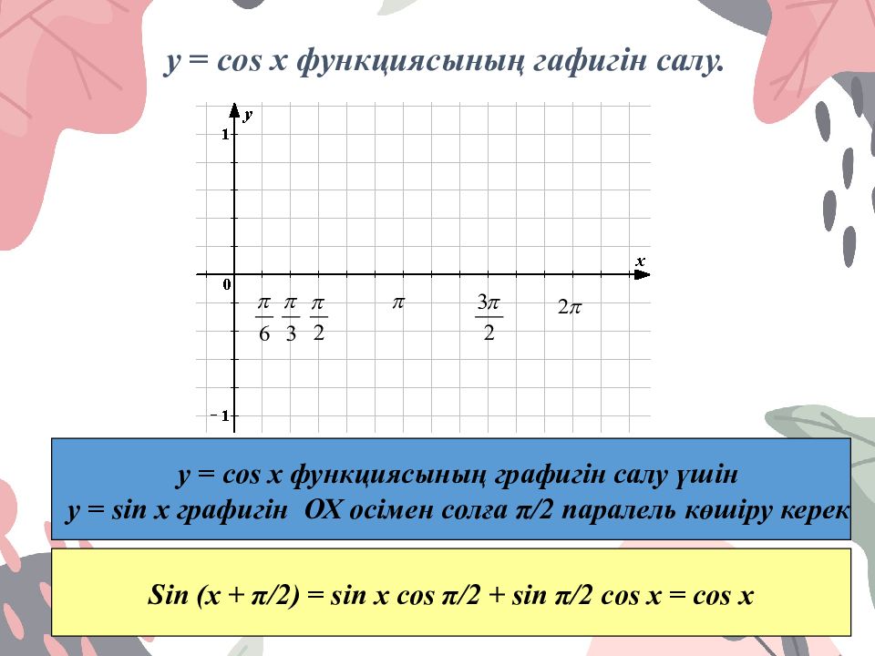 y = cos x функциясының гафигін салу. у = cos x функциясының графигін салу үшін у = sin x графигін ОХ осімен солға π /2 паралель көшіру керек Sin (x + π /2) = sin x cos π /2 + sin π /2 cos x = cos x