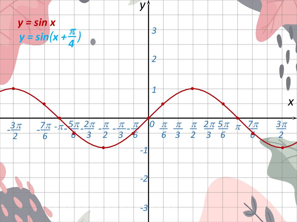 0 - - 2 3 6 6 - 7 6 - 5 6 2 х y 3 2 3 5 6 - 3 - 2 1 2 3 -1 -2 -3 - 3 2 - 7 6 3 2 y = sin x y = sin ( x + ) 4