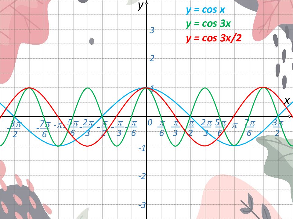 0 - - 2 3 6 6 - 7 6 - 5 6 2 х y 3 2 3 5 6 - 3 - 2 1 2 3 -1 -2 -3 - 3 2 - 7 6 3 2 y = соs x y = соs 3x y = соs 3x/2