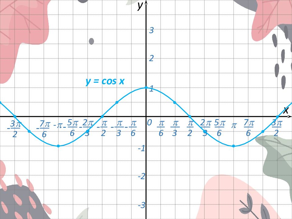 2 0 х y 6 3 2 3 5 6 6 - - 3 - 2 - 1 2 3 -1 -2 -3 - 2 3 - 5 6 - 3 2 - 7 6 7 6 3 2 y = соs x