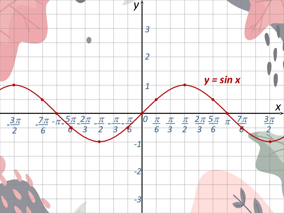 2 0 х y 6 3 2 3 5 6 6 - - 3 - 2 - 1 2 3 -1 -2 -3 - 2 3 - 5 6 - 3 2 - 7 6 7 6 3 2 y = sin x