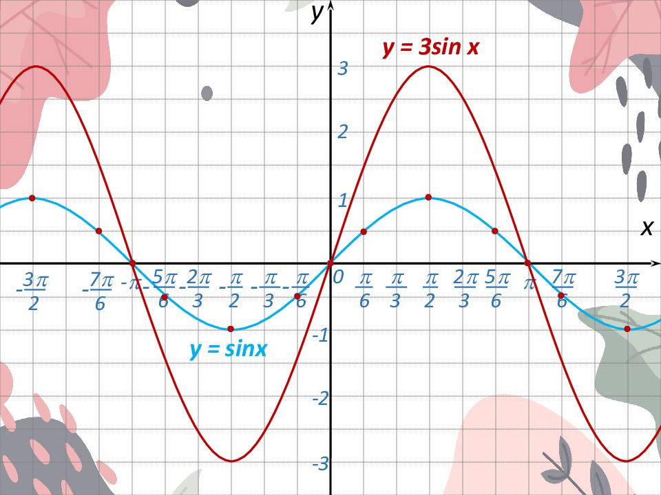 0 - - 2 3 6 6 - 7 6 - 5 6 2 х y 3 2 3 5 6 - 3 - 2 1 2 3 -1 -2 -3 - 3 2 - 7 6 3 2 y = 3sin x y = sinx