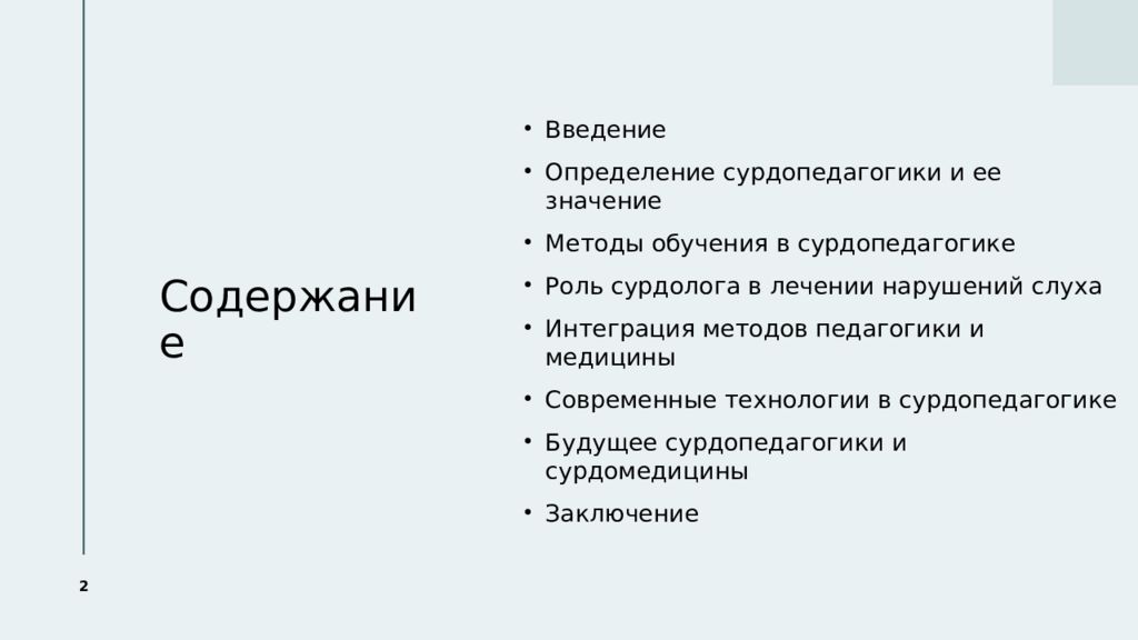 Введение Определение сурдопедагогики и ее значение Методы обучения в сурдопедагогике Роль сурдолога в лечении нарушений слуха Интеграция методов педагогики и медицины Современные технологии в сурдопедагогике Будущее сурдопедагогики и сурдомедицины Заключение 2