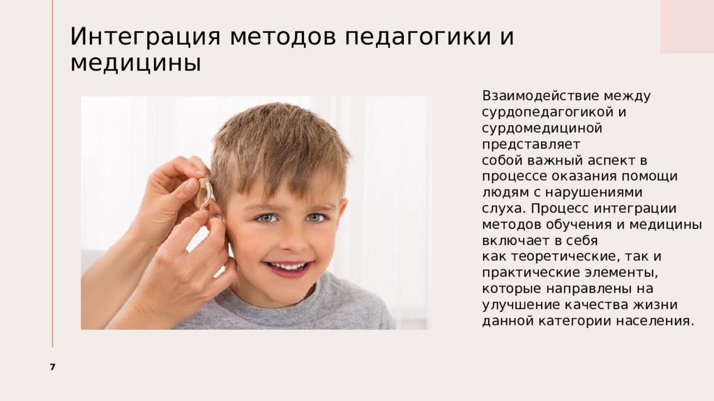 7 Взаимодействие между сурдопедагогикой и сурдомедициной представляет собой важный аспект в процессе оказания помощи людям с нарушениями слуха. Процесс интеграции методов обучения и медицины включает в себя как теоретические, так и практические элементы, которые направлены на улучшение качества жизни данной категории населения.