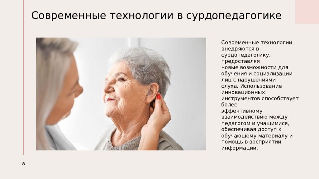 Современные технологии внедряются в сурдопедагогику, предоставляя новые возможности для обучения и социализации лиц с нарушениями слуха. Использование инновационных инструментов способствует более эффективному взаимодействию между педагогом и учащимися, обеспечивая доступ к обучающему материалу и помощь в восприятии информации. 8