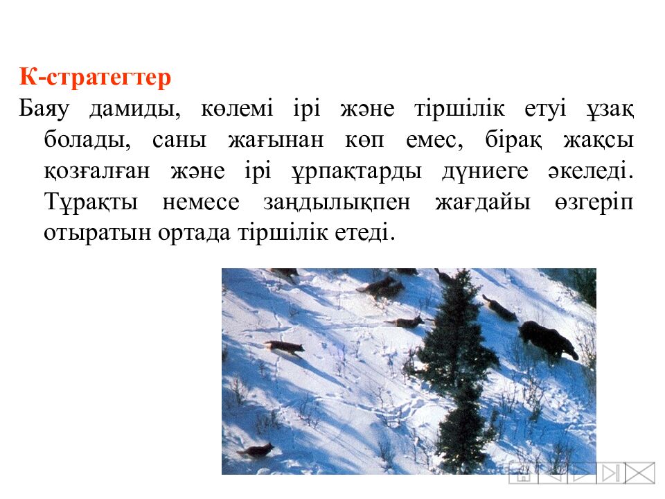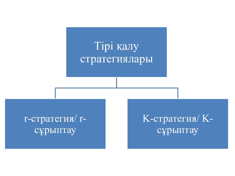 К-стратегтер Баяу дамиды, көлемі ірі және тіршілік етуі ұзақ болады, саны жағынан көп емес, бірақ жақсы қозғалған және ірі ұрпақтарды дүниеге әкеледі. Тұрақты немесе заңдылықпен жағдайы өзгеріп отыратын ортада тіршілік етеді.
