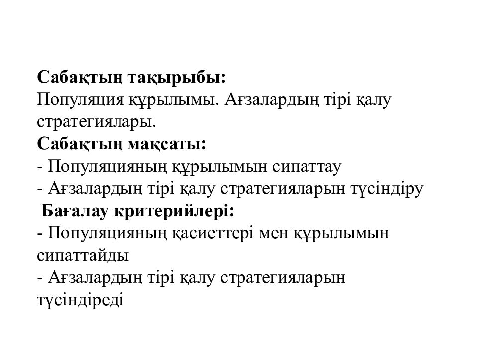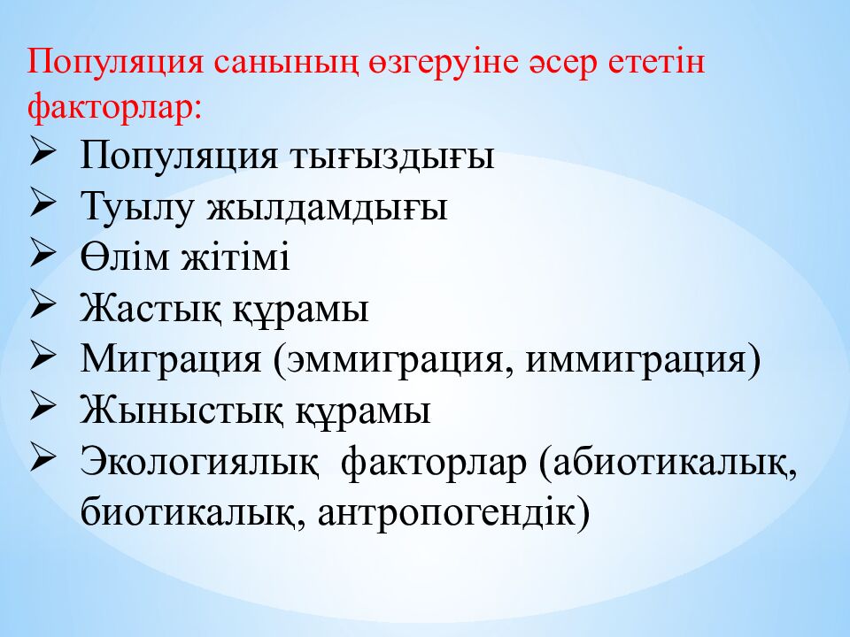 Популяция санының өзгеруіне әсер ететін факторлар: Популяция тығыздығы Туылу жылдамдығы Өлім жітімі Жастық құрамы Миграция (эммиграция, иммиграция) Жыныстық құрамы Экологиялық факторлар (абиотикалық, биотикалық, антропогендік)