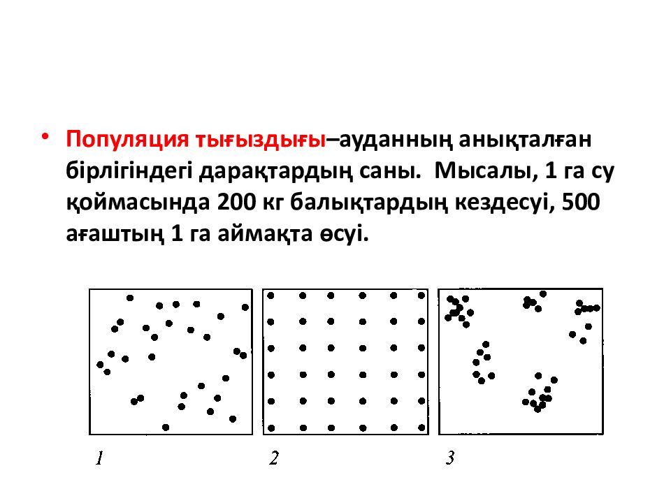 Популяция тығыздығы –ауданның анықталған бірлігіндегі дарақтардың саны. Мысалы, 1 га су қоймасында 200 кг балықтардың кездесуі, 500 ағаштың 1 га аймақта өсуі.