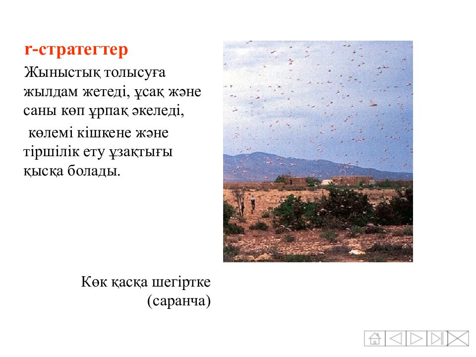 r - стратегтер Жыныстық толысуға жылдам жетеді, ұсақ және саны көп ұрпақ әкеледі, көлемі кішкене және тіршілік ету ұзақтығы қысқа болады. Көк қасқа шегіртке (саранча)