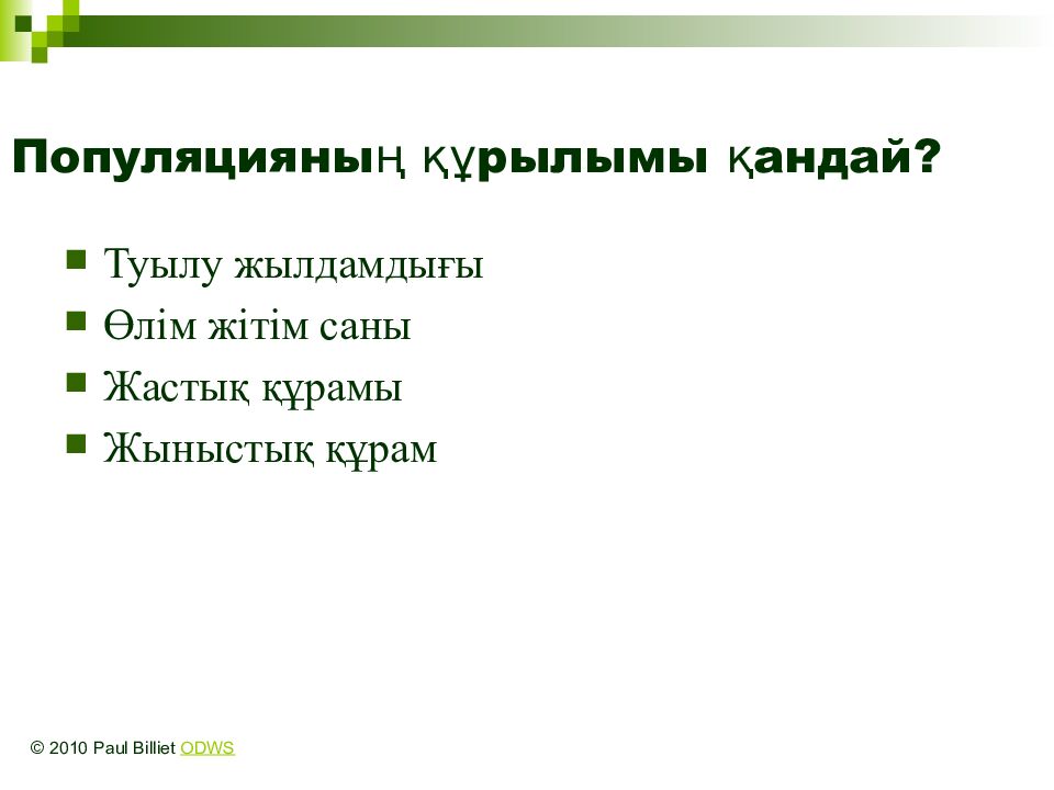 Туылу жылдамдығы Өлім жітім саны Жастық құрамы Жыныстық құрам © 2010 Paul Billiet ODWS