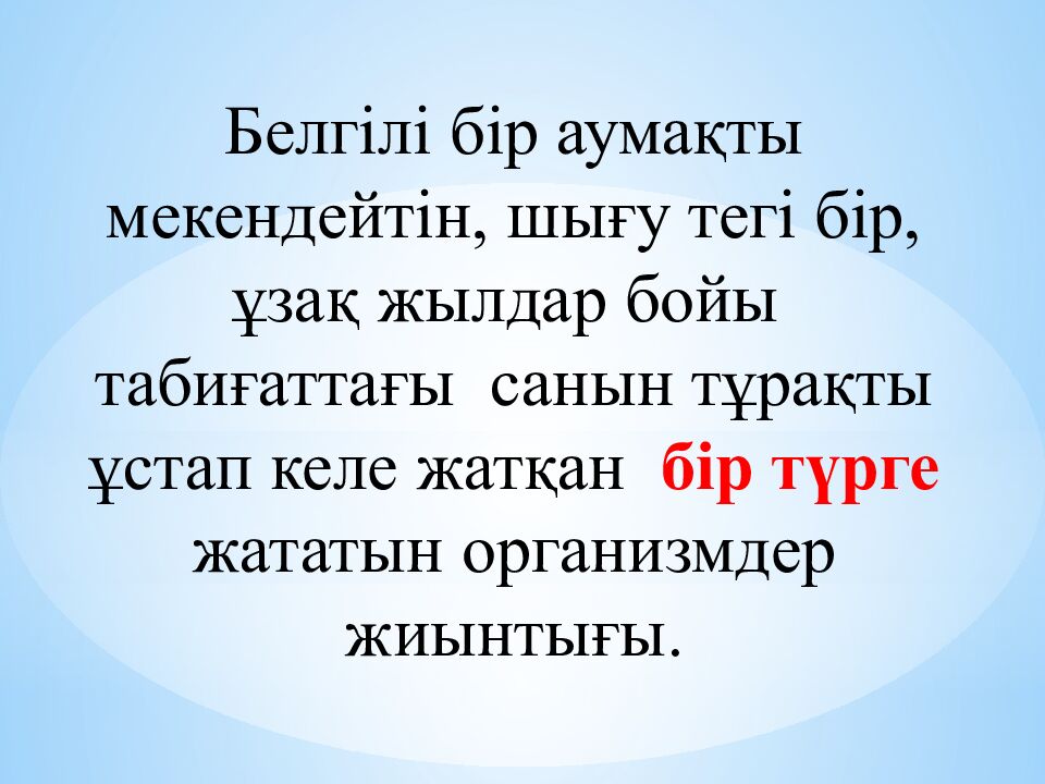 Белгілі бір аумақты мекендейтін, шығу тегі бір, ұзақ жылдар бойы табиғаттағы санын тұрақты ұстап келе жатқан бір түрге жататын организмдер жиынтығы.