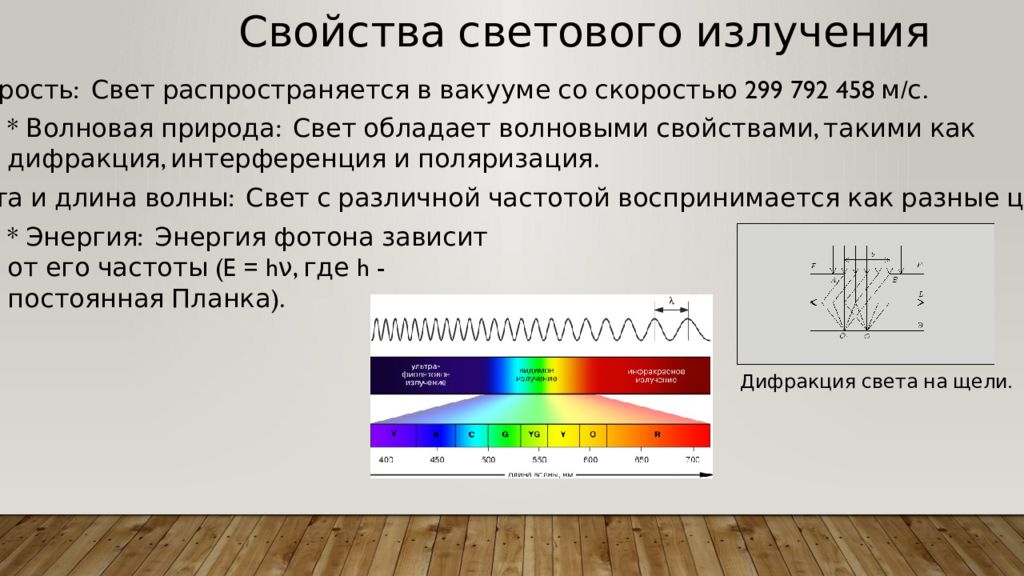 Свойства светового излучения * Скорость: Свет распространяется в вакууме со скоростью 299 792 458 м/с. * Волновая природа: Свет обладает волновыми свойствами, такими как дифракция, интерференция и поляризация. * Частота и длина волны: Свет с различной частотой воспринимается как разные цвета. * Энергия: Энергия фотона зависит от его частоты (E = hν, где h - постоянная Планка). Дифракция света на щели.