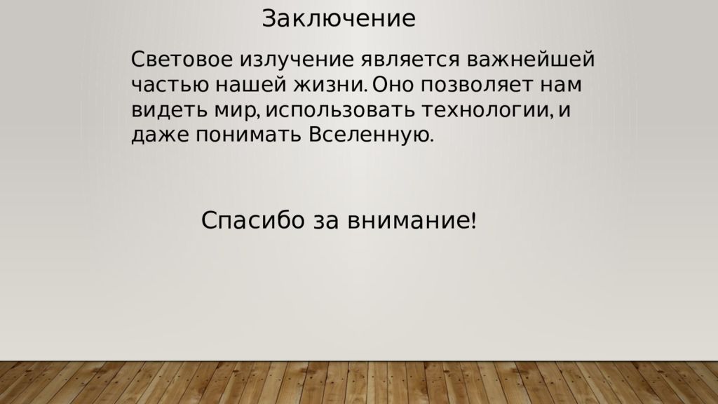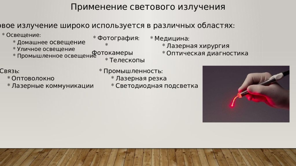 Применение светового излучения Световое излучение широко используется в различных областях: * Освещение: * Домашнее освещение * Уличное освещение * Промышленное освещение * Фотография: * Фотокамеры * Телескопы * Медицина: * Лазерная хирургия * Оптическая диагностика * Связь: * Оптоволокно * Лазерные коммуникации * Промышленность: * Лазерная резка * Светодиодная подсветка
