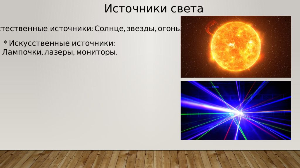 Источники света * Естественные источники: Солнце, звезды, огонь. * Искусственные источники: Лампочки, лазеры, мониторы.