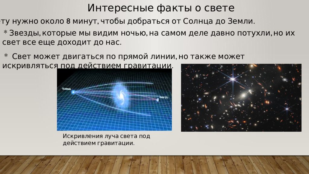 Интересные факты о свете * Свету нужно около 8 минут, чтобы добраться от Солнца до Земли. * Звезды, которые мы видим ночью, на самом деле давно потухли, но их свет все еще доходит до нас. * Свет может двигаться по прямой линии, но также может искривляться под действием гравитации. Искривления луча света под действием гравитации.