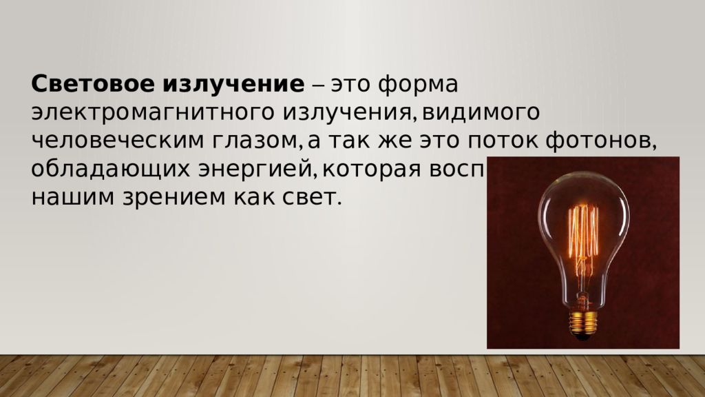 Световое излучение – это форма электромагнитного излучения, видимого человеческим глазом, а так же это поток фотонов, обладающих энергией, которая воспринимается нашим зрением как свет.