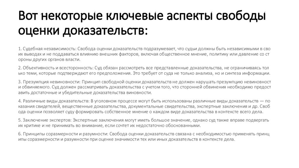Слайд 3: Вот некоторые ключевые аспекты свободы оценки доказательств: