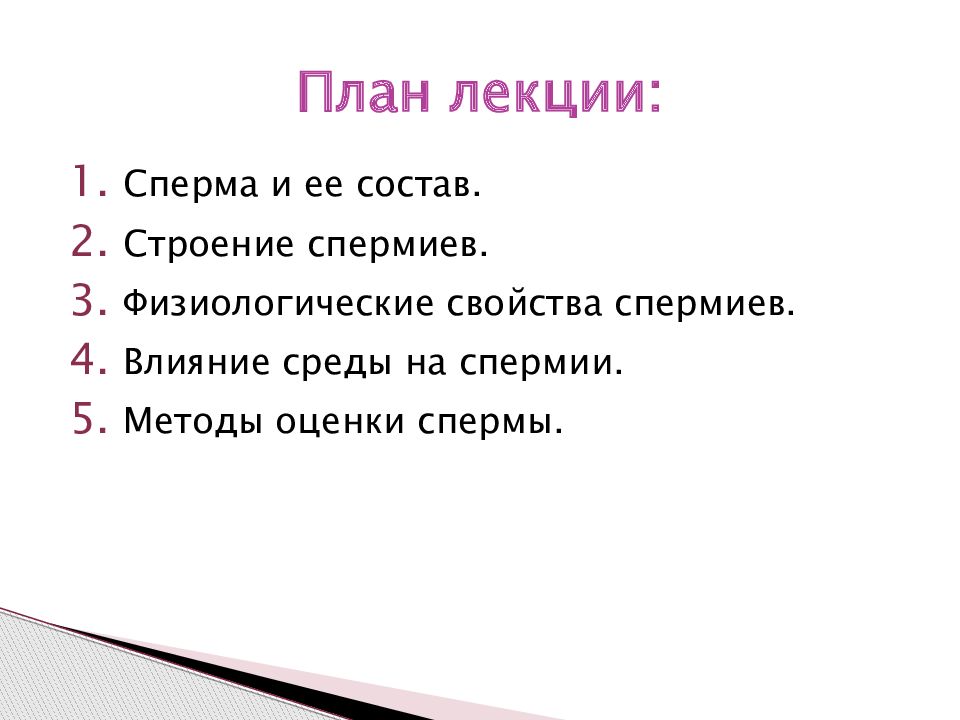 Сперма и ее состав. Строение спермиев. Физиологические свойства спермиев. Влияние среды на спермии. Методы оценки спермы. План лекции: